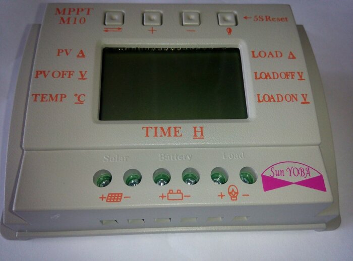Контроллер заряда MPPT M10 редназначен для контроля процессов заряда/разряда АКБ с рабочими напряжениями 12В или 24В и максимальными токами 10А. Данная модель не имеет прямого отношения к МРРТ-технологии заряда АКБ, но работает по ШИМ технологии с интеллектуальным алгоритмом заряда АКБ, что позволяет, по сравнению с просто ШИМ технологией заряда, получить большую отдачу энергии от солнечной панели. Контроллер, как замечено выше, предназначен для управления режимами заряда и разряда АКБ в составе солнечной электростанции, а также - режимами работы/подключения нагрузки. Контроллер оснащён ЖК-дисплеем для отображения параметров работы системы, а с помощью кнопок пользователь может произвести гибкую настройку параметров. Контроллер обеспечивает защиту от перегрузок и короткого замыкания в цепи нагрузки, от перезарядки и переразряда АКБ, неправильной полярности подключения АКБ. В зависимости от напряжения на АКБ, контроллер будет регулировать ток зарядки и подавать/отключать питание нагрузки. Контроллер автоматически подстраивается под подключаемый АКБ - на напряжение 12В или 24В. В контроллере используется технология температурной компенсации напряжения в режиме заряда АКБ, для чего в комплекте поставки есть внешний температурный датчик, устанавливаемый в специальный разьём, расположенный на верхней панели корпуса. Для эффективного отвода тепла и защиты от перегрева самого контроллера в нём применена пассивная система естественного охлаждения - задняя стенка выполнена в виде пластины-радиатора. Органами управления контроллера являются четыре функциональные кнопки на передней панели (слева направо): кнопка переключения интерфейсов, кнопка изменения на увеличение, кнопка изменения параметров на уменьшение, кнопка с функцией подключения/отключения нагрузки. Контроллер предназначен для работы с токами силой до 10А по любому из портов и может быть подключен к солнечным панелям мощностью не более 150Вт (12В) или 300Вт (24В) (всегда необходимо делать запас по току от максимального значения 20-30%).