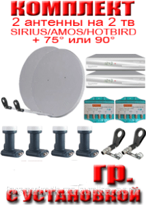 1. Монтаж и настройка двух спутниковых антенн на прием четырех спутников Sirius Amos Hotbird - список каналов по ссылке (кроме Xtra tv) 80 Русско - Украинских каналов + около 500 зарубежных. + вторая антенна - на выбор 75 градус или 90 градус. При подключении на экстра ТВ: доплачивается 40 гр. за каждый ресивер с картоприемником + цена за карту.