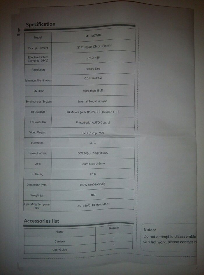 | Фокусное расстояние | 3.6 (мм) |