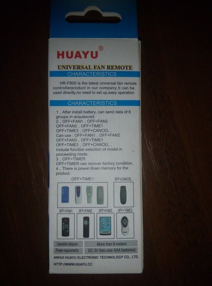 Цей універсальний пульт для вентиляторів має 6 різних кодувань. Для того щоб налаштувати його на ваш пристрій потрібно спробувати все кодування по черзі вводячи комбінації натисканням двох кнопок. Пари кнопок потрібно утримувати протягом 5 секунд а потім пробувати пульт на включення/ виключення вашого пристрою. Нижче комбінації кнопок які необхідно нажиать і утримувати на протязі 5 секунд для перекодування.
